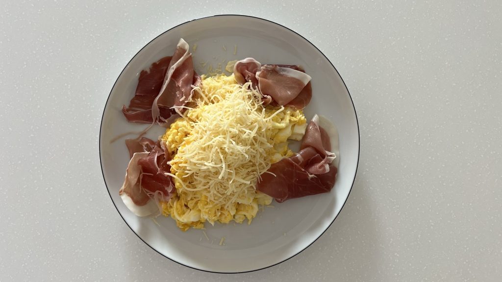 Pokud jde o hlavní jídlo dne, tak jsem se rozhodl vsadit na lehce stravitelná míchaná vajíčka na másle v kombinaci se strouhaným ementálem. K tomu jako bonus prosciutto crudo. V Makru jsem našel italského výrobce, který do něj nepřidává žádné konzervanty. Pouze vepřové maso a sůl.