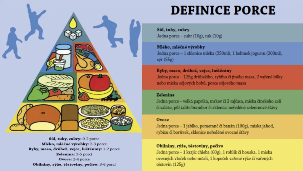 Klasická potravinová pyramida je vtloukána do hlavy už dětem ve školce a paní učitelky vehementně podporují vyváženou stravu, která zahrnuje i oběd v podobě nudlí s mákem a cukrem nebo ke svačině horkou čokoládu s rohlíkem.