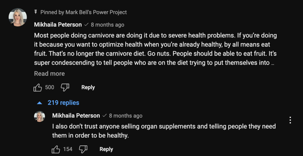 Jak píše Mikhaila Peterson v komentáři pod tímto videem, kde Saladino obhajuje svůj šílený názor, většina lidí se pustí do carnivore diety ze zdravotních důvodů.